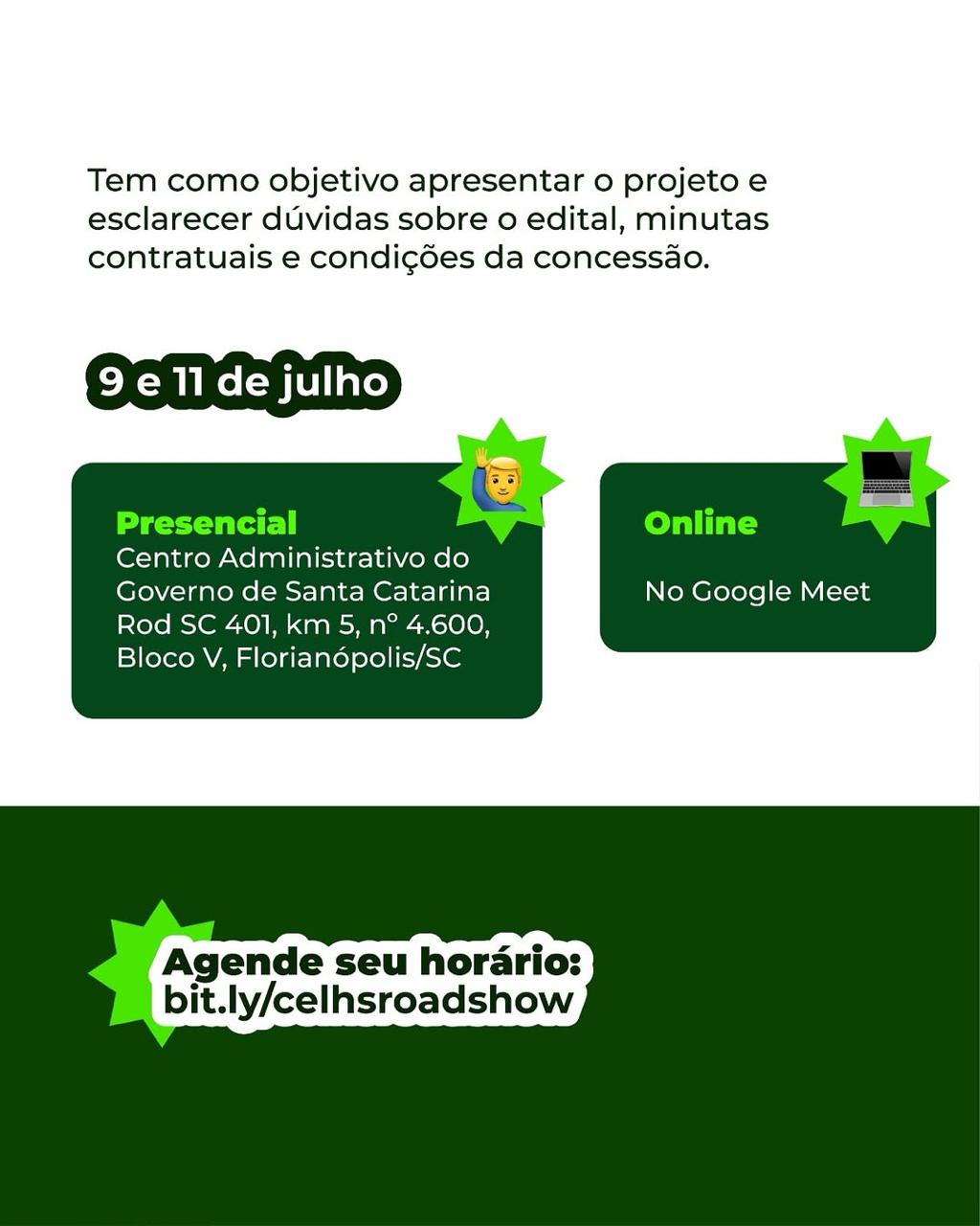 O objetivo é apresentar o projeto e tirar dúvidas sobre o edital e as condições da concessão. As reuniões serão individuais, com duração de 60 minutos.