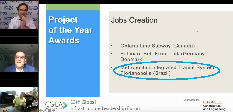O projeto de mobilidade urbana da Grande Florianópolis venceu prêmio em um dos maiores eventos internacionais de infraestrutura nesta quinta-feira, 17, que teve a participação de forma virtual do secretário de Parcerias Público-Privadas do Governo de Santa Catarina (PPPs), Ramiro Zinder. A premiação, intitulada Oracle Project of the Year Awards, fez parte do 13º Global Insfrastructure Leadreship Forum (GViP), realizado em Whashington, Estados Unidos.